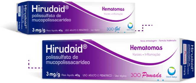 Hirudoid® (polissulfato de mucopolissacarídeo). MS – 1.0454.0013. Indicações – tratamento de manchas roxas após traumas, contusões, cirurgias, flebites e no local da injeção. Auxilia no tratamento de: varizes nas pernas; inflamação dos vasos linfáticos ou linfonodos; furúnculos; mastite. HIRUDOID® GEL – não pode ser usado em feridas abertas. SE PERSISTIREM OS SINTOMAS, O MÉDICO DEVERÁ SER CONSULTADO. MBR_08